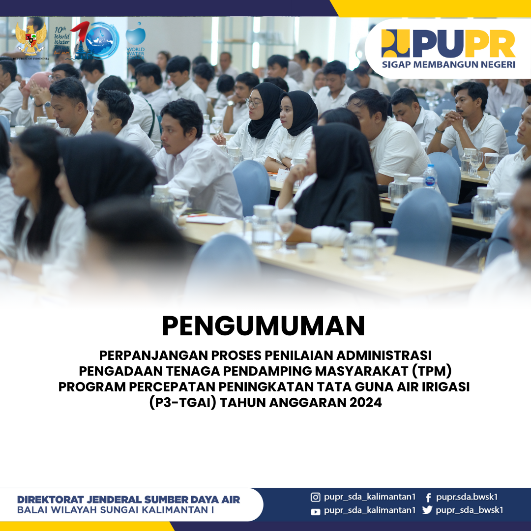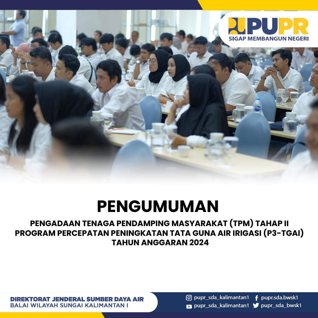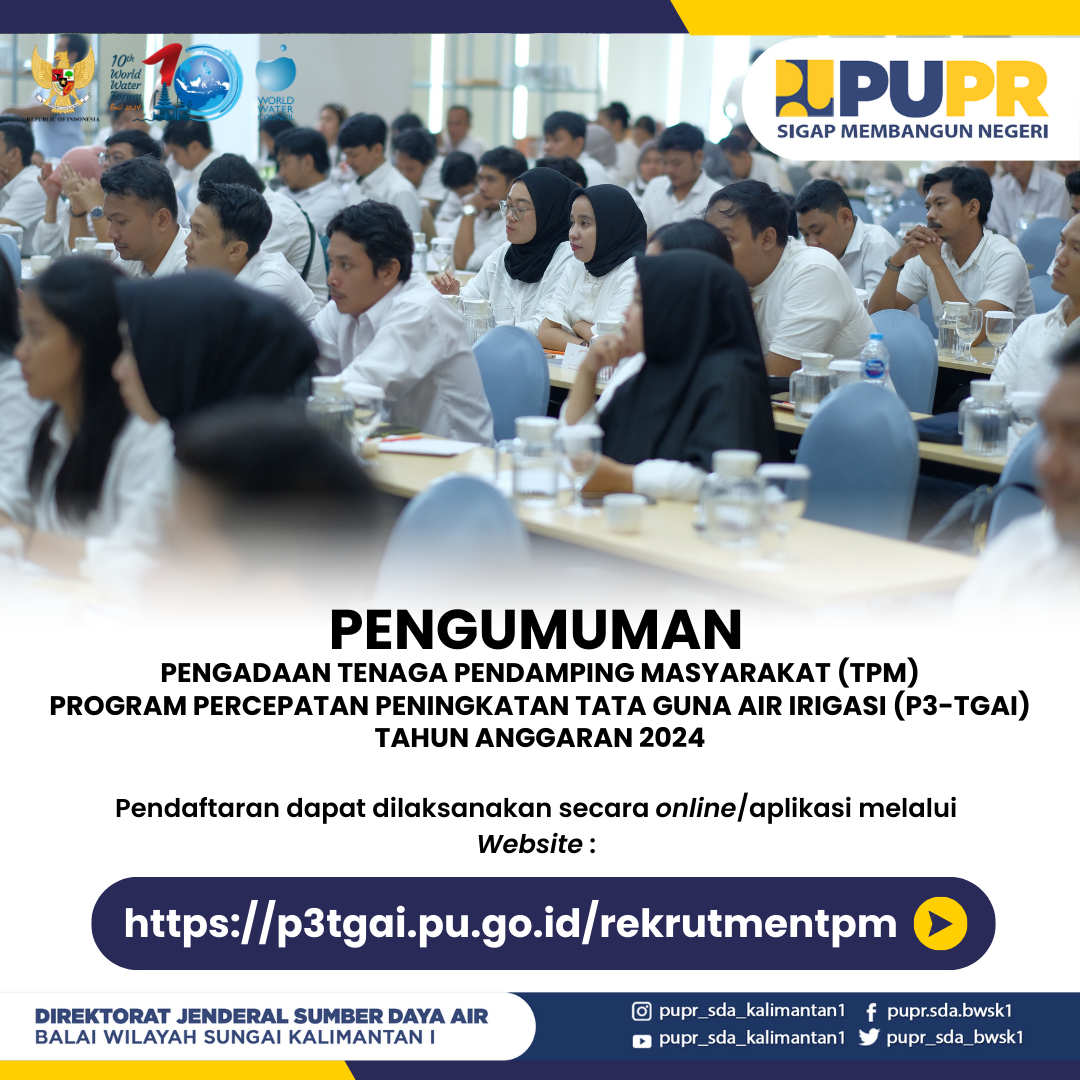 PENGUMUMAN PENGADAAN TENAGA PENDAMPING MASYARAKAT (TPM) PROGRAM PERCEPATAN PENINGKATAN TATA GUNA AIR IRIGASI (P3-TGAI) TAHUN ANGGARAN 2024