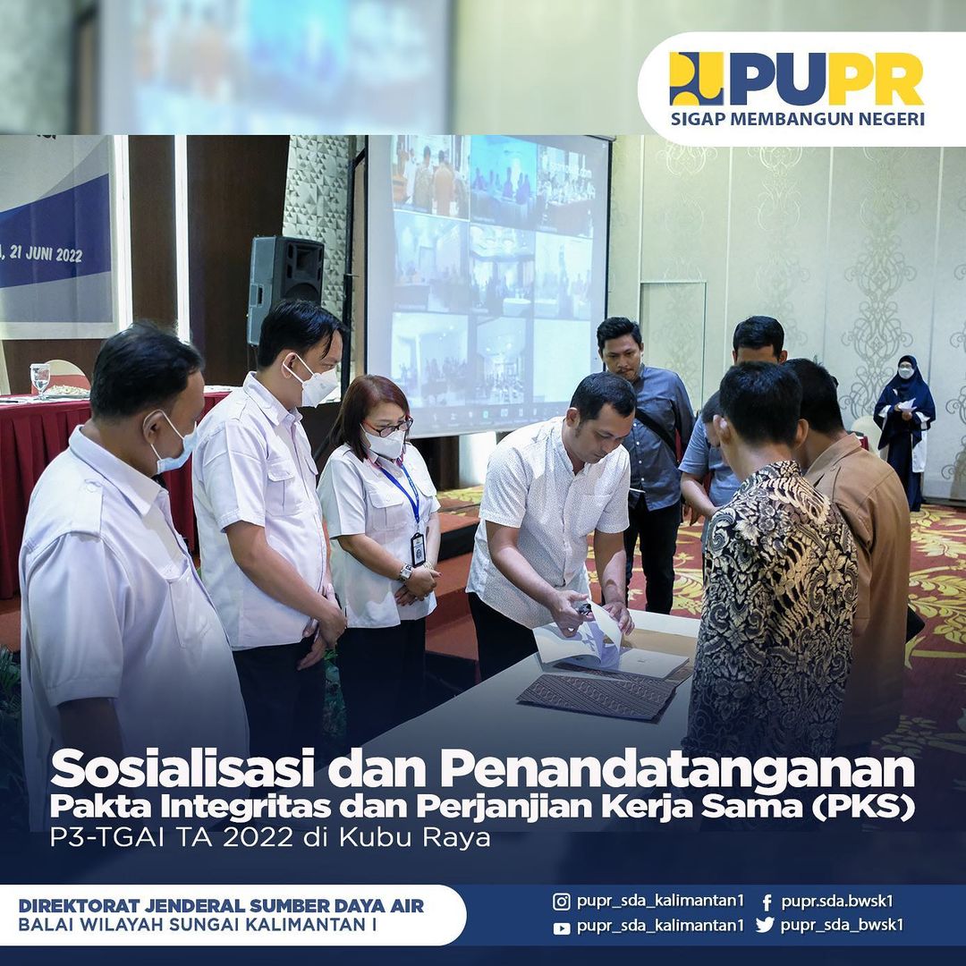 Balai Wilayah Sungai Kalimantan I Pontianak menyelenggarakan kegiatan Sosialisasi dan Penandatanganan Pakta Integritas dan Perjanjian Kerjasama (PKS) Program Percepatan Peningkatan Tata Guna Air Irigasi (P3TGAI) Tahap kedua, Selasa (21/06/2022) di Hotel Qubu Resort, Kubu Raya.