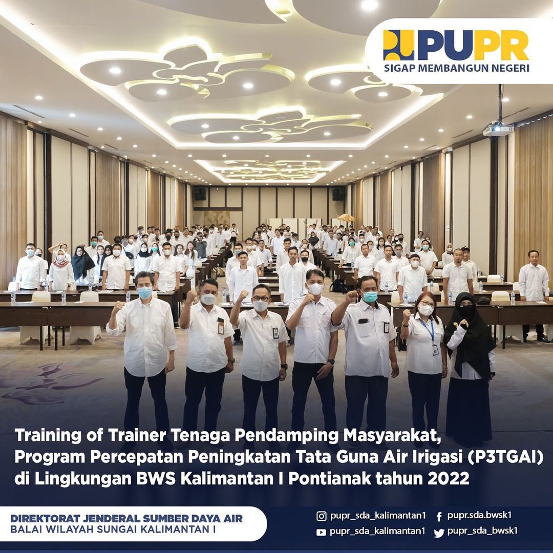 Dalam rangka pelaksanaan kegiatan Program Percepatan Peningkatan Tata Guna Air Irigasi (P3-TGAI) Tahun Anggaran 2022, Balai Wilayah Sungai Kalimantan I Pontianak melalui PPK Operasi dan Pemeliharaan SDA III menggelar Training of Trainer Tenaga Pendamping Masyarakat (TPM) di hotel Orchardz Perdana. Kegiatan ini berlangsung selama empat hari dan dilakukan dalam dua tahap, yaitu mulai tanggal 17-20 Mei 2022.