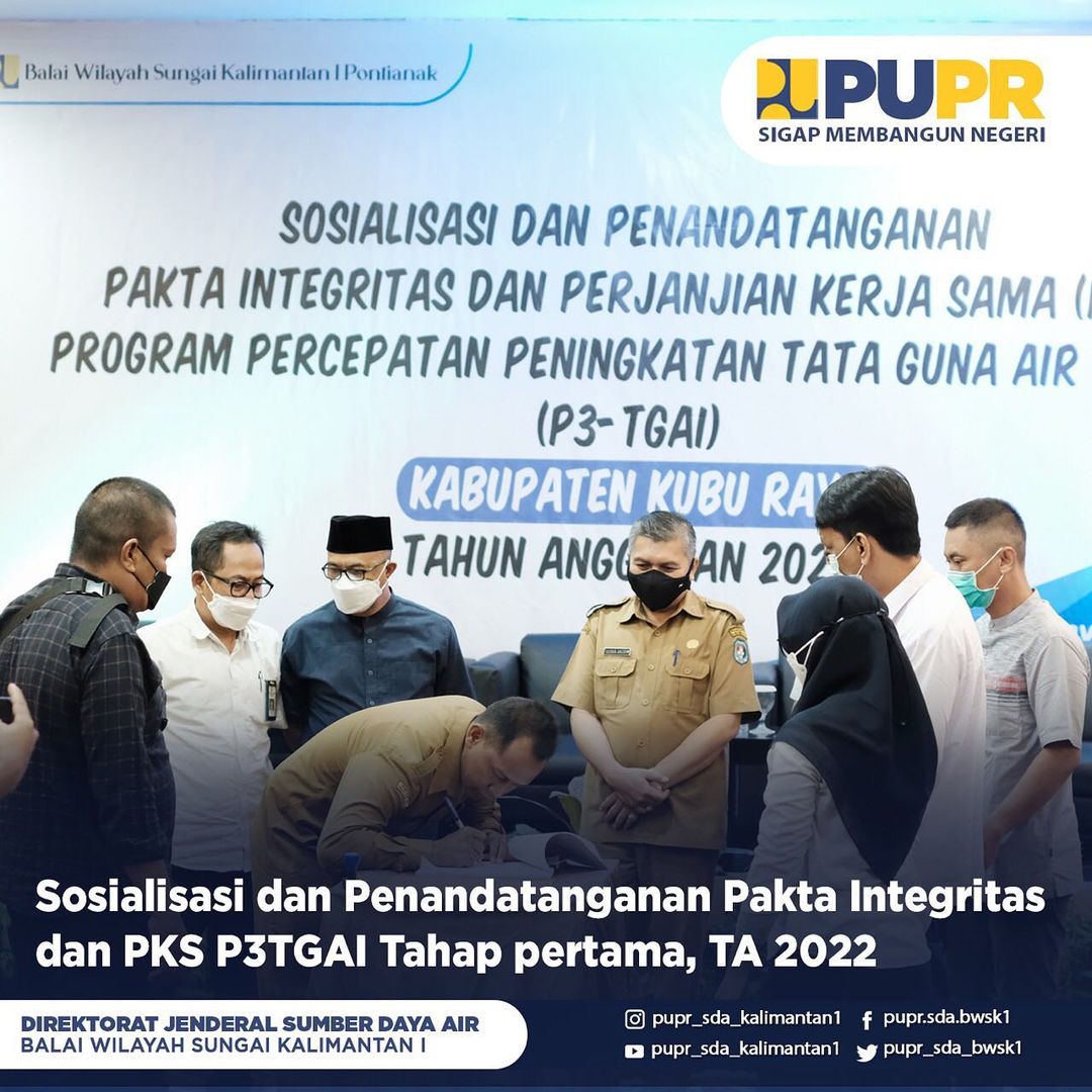 Balai Wilayah Sungai Kalimantan (BWSK) I Pontianak menyelenggarakan kegiatan Sosialisasi dan Penandatanganan Pakta Integritas dan Perjanjian Kerjasama (PKS) Program Percepatan Peningkatan Tata Guna Air Irigasi (P3TGAI) Tahap pertama, Senin (25/04/2022).