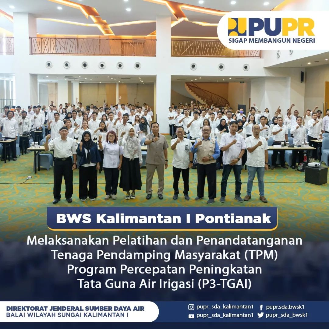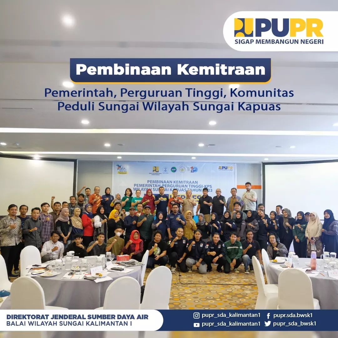 Pada Jumat, 19 Mei 2023, Balai Wilayah Sungai Kalimantan I Pontianak melaksanakan kegiatan Pembinaan Kemitraan Pemerintah, Perguruan Tinggi, Komunitas Peduli Sungai Wilayah Sungai Kapuas Tahun 2023 yang berlangsung di Hotel Harris.